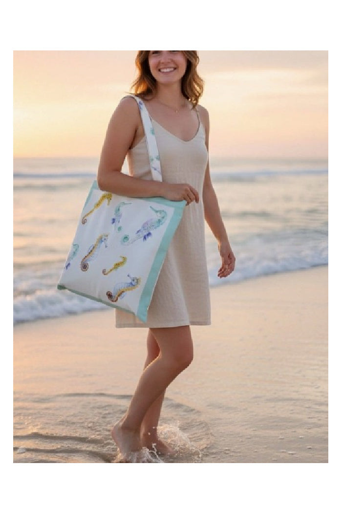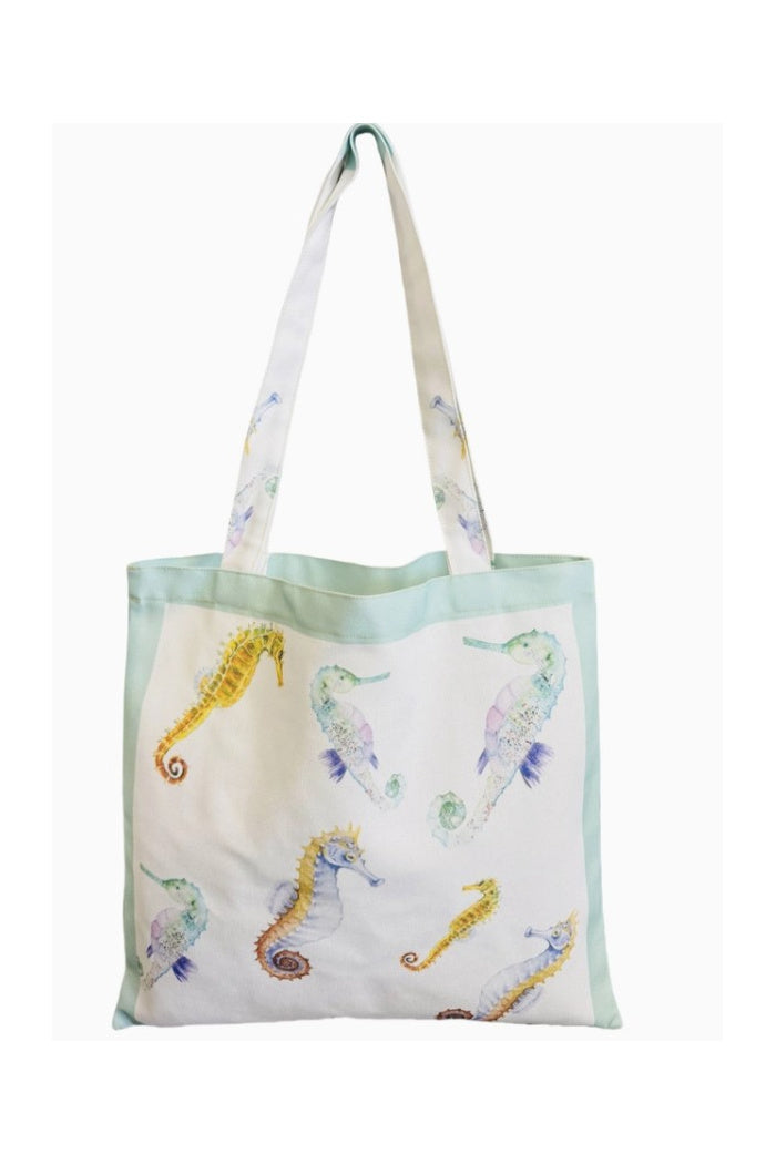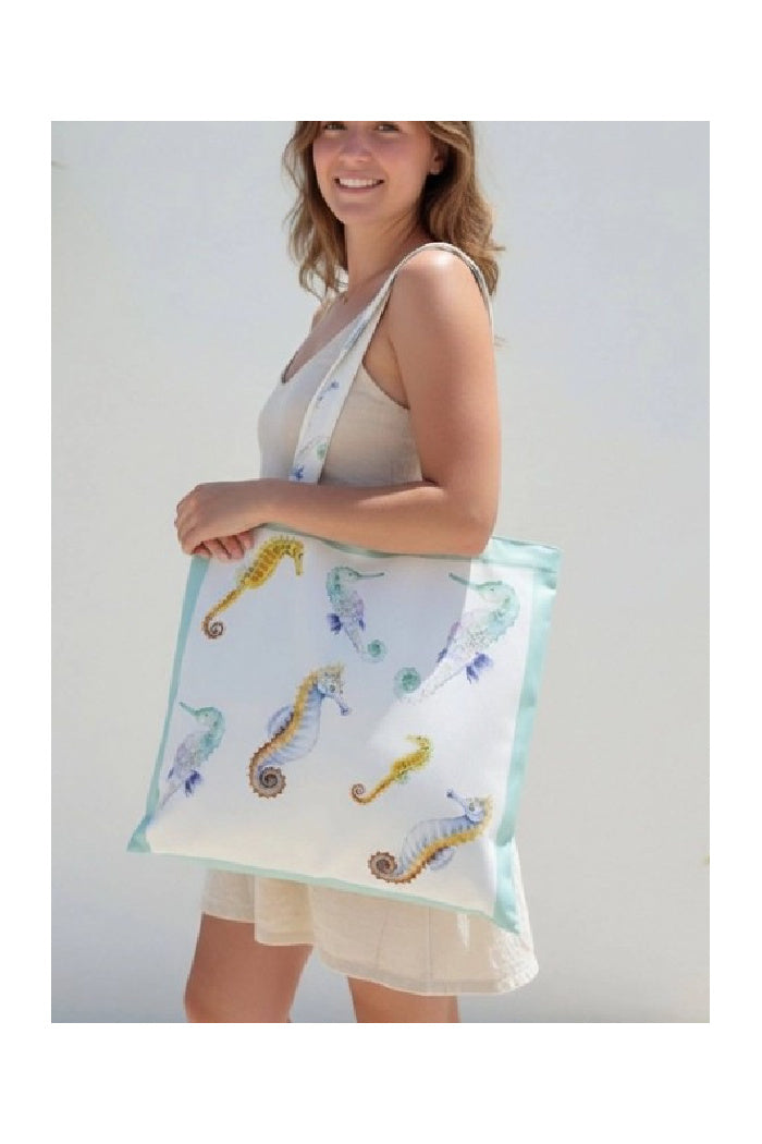 Aqua Multicolor Seahorse Bordered Luxe Tote Bag