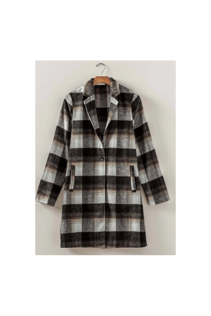 Design: A classic single-breasted coat featuring a large-scale buffalo check pattern, a notched lapel, and a single-button closure.