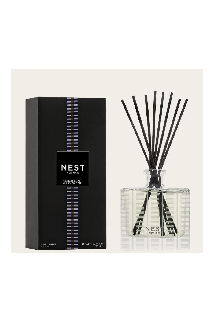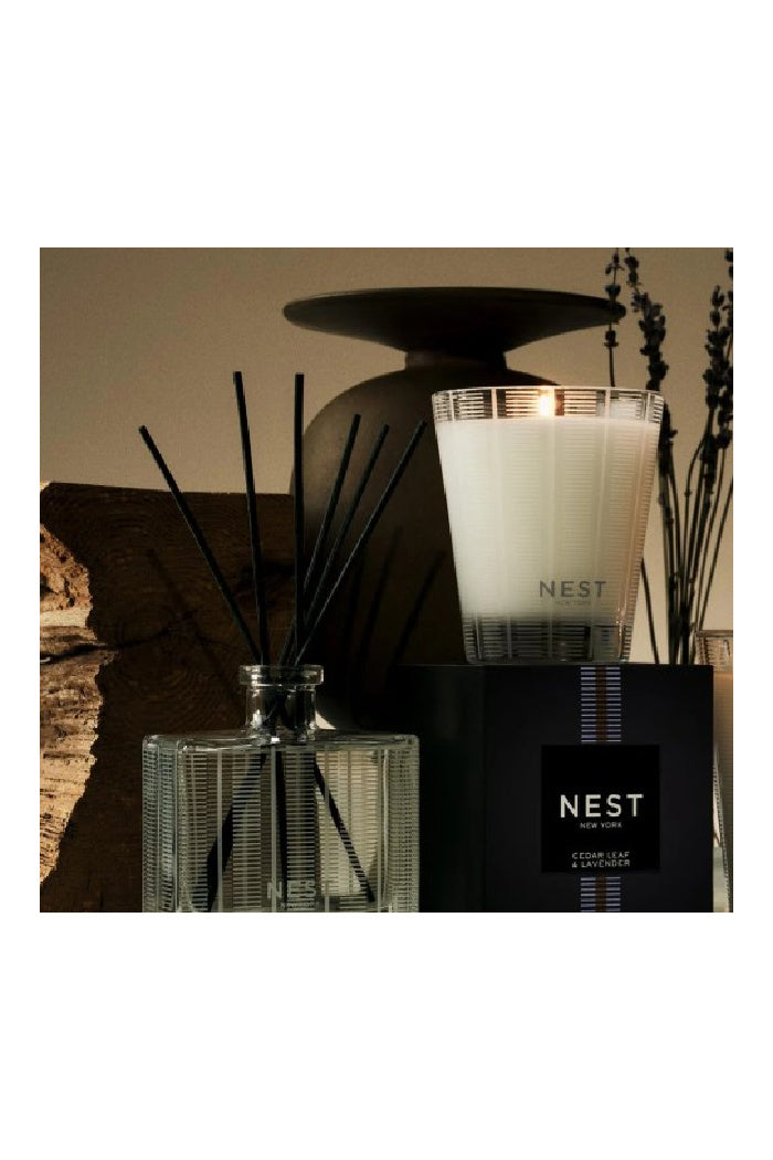 Nest Cedar Leaf and Lavender Reed Diffusor: Rosemary, lavender and sage are enhanced with cedar leaves and a touch of eucalyptus. Nest Reed Diffusers are carefully crafted with the highest quality fragrance oils and are designed to continuously fill any space with a lush, memorable fragrance. The alcohol-free formula releases fragrance slowly and evenly into the air for approximately 90 days. Net Weight: 5.9 oz.; Dimensions: 8" tall w/ reeds