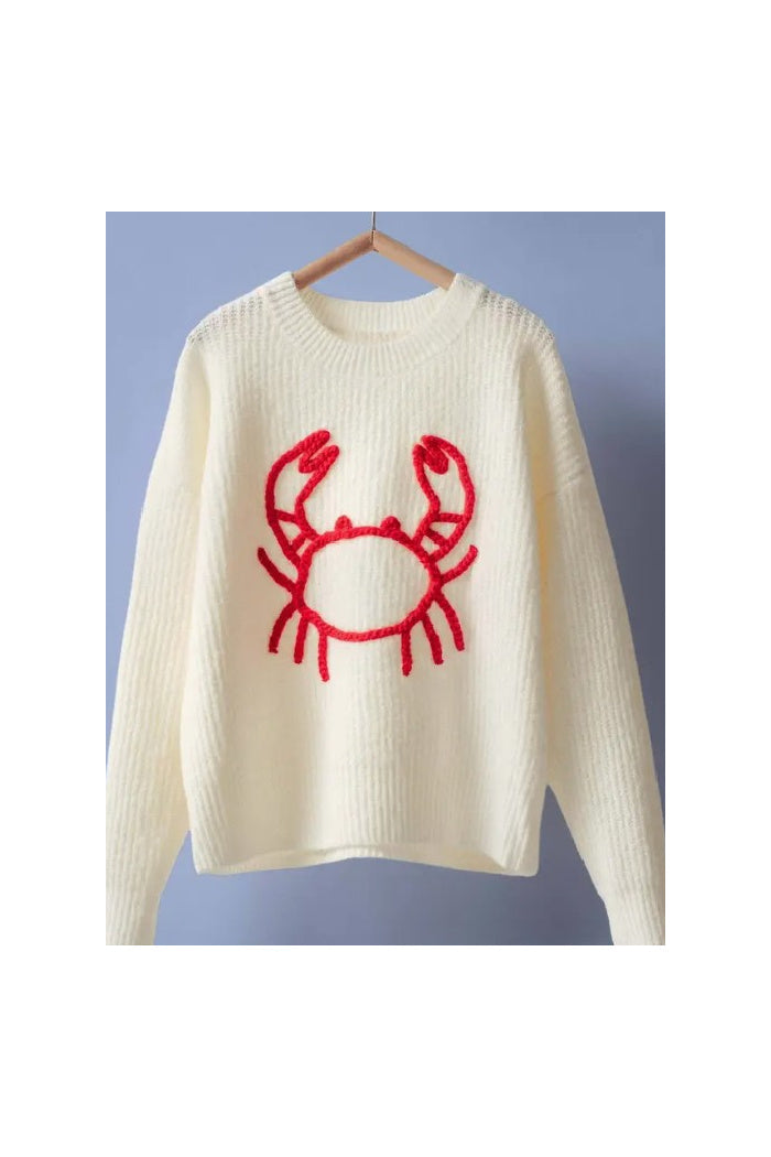 This whimsical sweater brings a playful touch to your wardrobe with its bold red crab embroidery, crafted from chunky yarn for standout texture and personality.