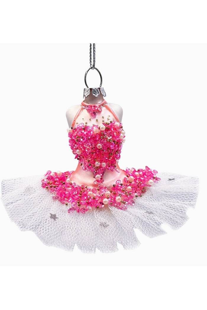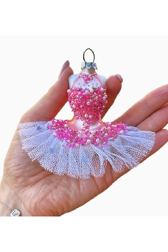 This exquisite handcrafted ballerina dress ornament features a delicate pink beaded bodice adorned with shimmering pearls and gold accents, while the soft tulle skirt adds an ethereal touch with silver star embellishments. Made from high-quality glass, it’s a timeless piece perfect for ballet lovers, dancers, or anyone who appreciates the artistry of ballet. Whether hanging on your holiday tree or given as a thoughtful gift, this elegant ornament is sure to become a cherished keepsake.