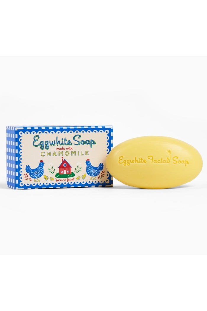 A gentle facial soap scented with chamomile and enriched with egg white for a soft, clean finish. The Eggwhite and Chamomile Facial Soap from Kala has a smooth oval bar and vintage-inspired packaging that makes it a charming gift or countertop accent. It cleanses without stripping and is suited for daily use on normal to dry skin. Keep it on a soap dish between uses to preserve the fragrance and shape.