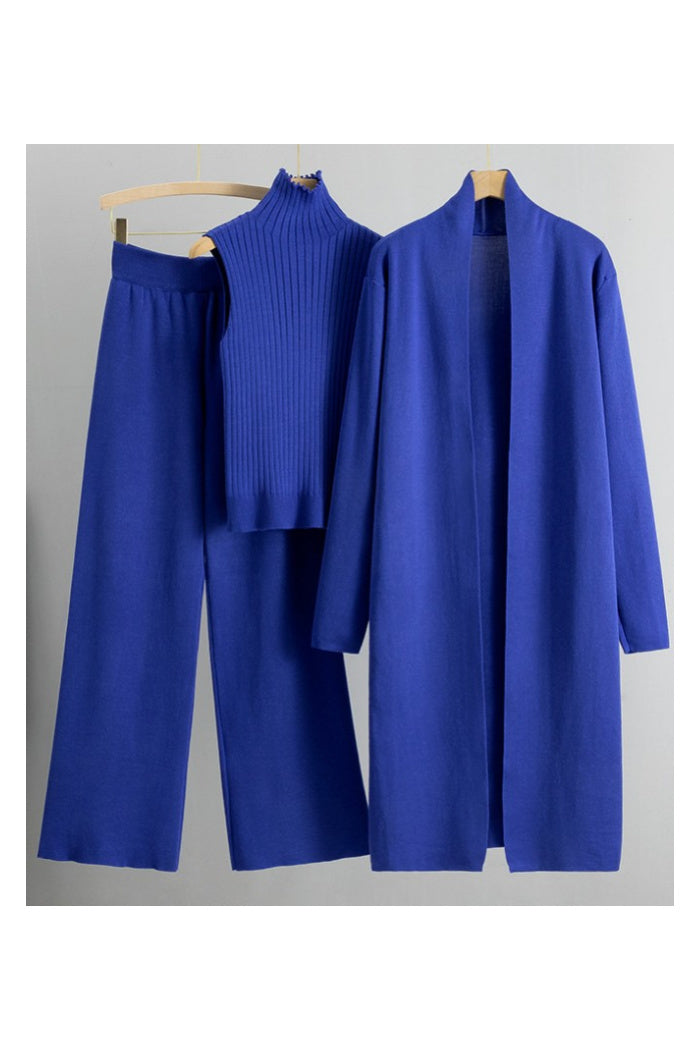 Designed for comfort with a refined touch, this three-piece Knitted Set includes a matching vest, cardigan, and pants for a perfectly coordinated look. Crafted from soft knit fabric, it offers warmth, stretch, and all-day ease without sacrificing style.