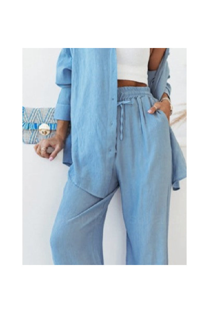 Long Sleeve Buttoned Lapel Shirt Top + High-Waisted Elastic Pants Two-Piece Set