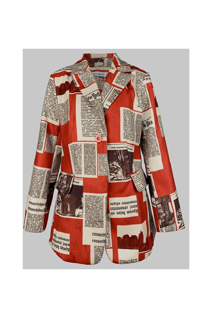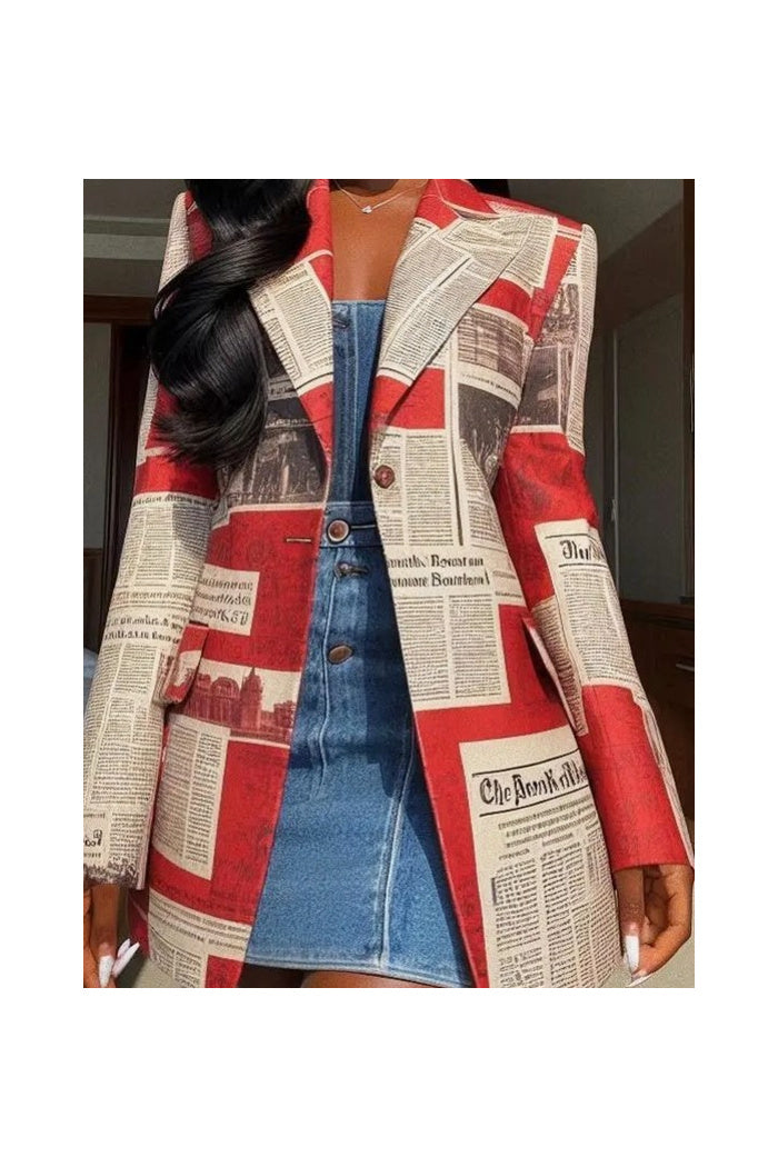 Make a bold style statement with this Long Sleeve Loose-Fit Blazer featuring an eye-catching newspaper print. Designed with a classic notched collar, button-front closure, and functional pockets, it blends tailored structure with a relaxed, contemporary silhouette.