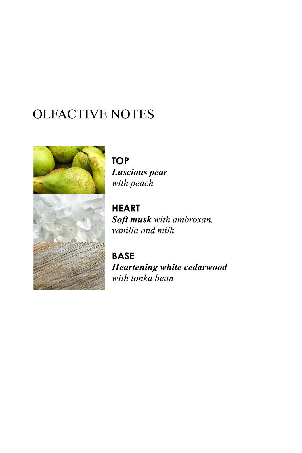 A base of white cedarwood and tonka bean.
