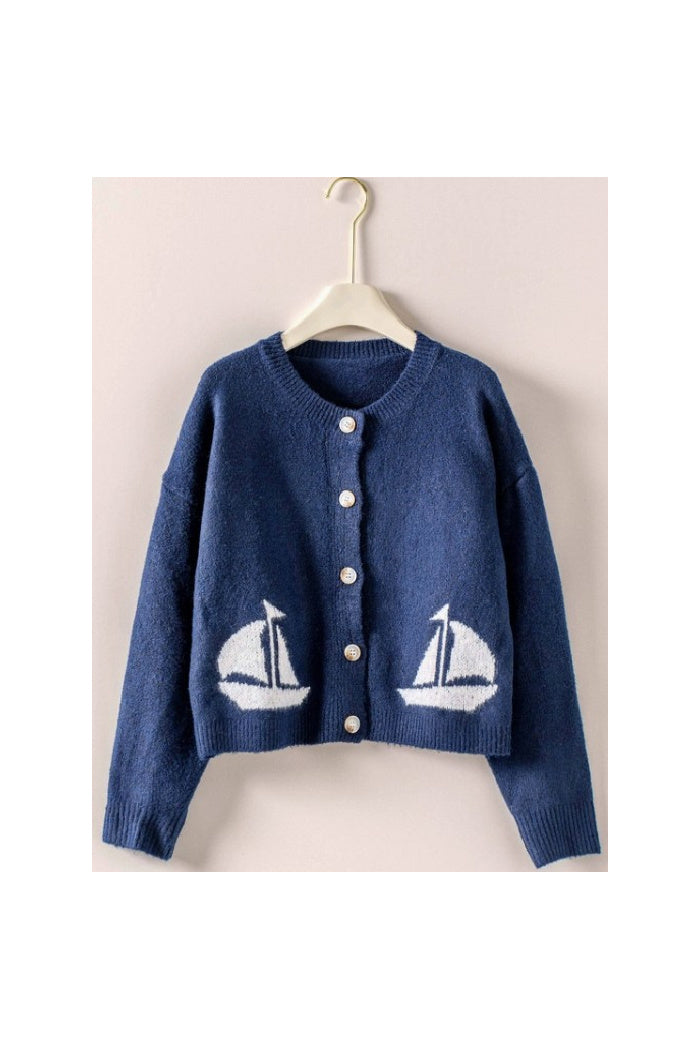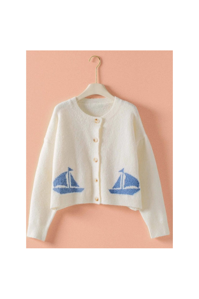 Embrace the coastal aesthetic with this charming sailboat knit cardigan. Featuring a classic button-down front and playful nautical graphics, this soft sweater is the perfect light layer for breezy beach evenings, seaside vacations, or preppy weekend style.
