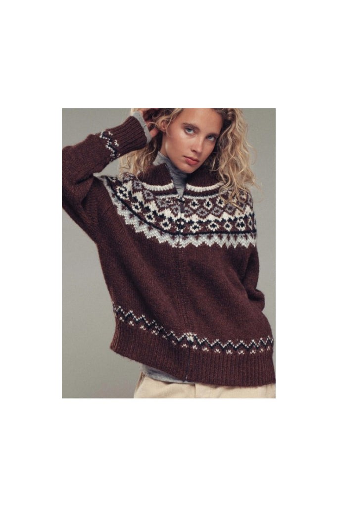 This cozy wool-blend cardigan brings timeless Nordic charm to your cold-weather wardrobe. Featuring a traditional Fair Isle pattern and central zipper, it’s perfect for layering over your favorite basics all season long.