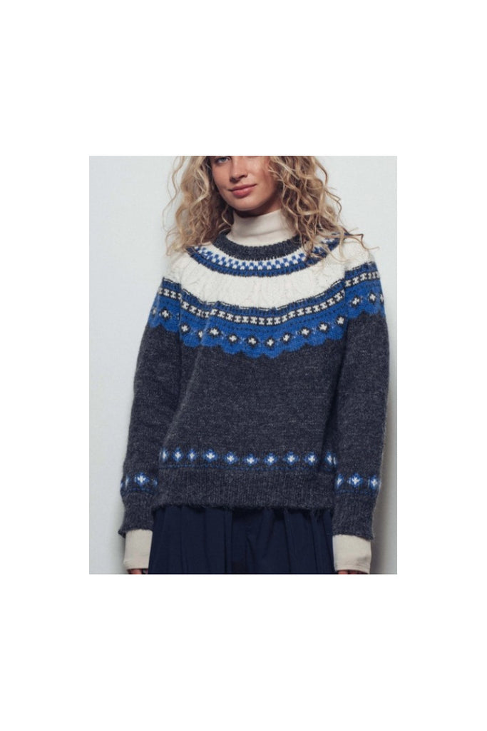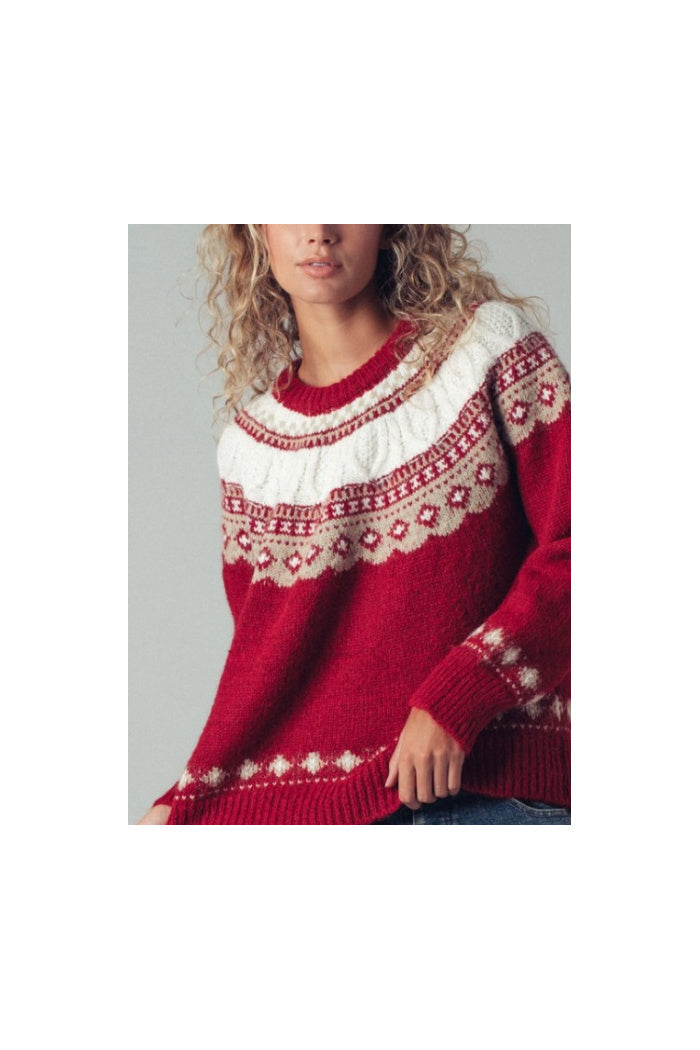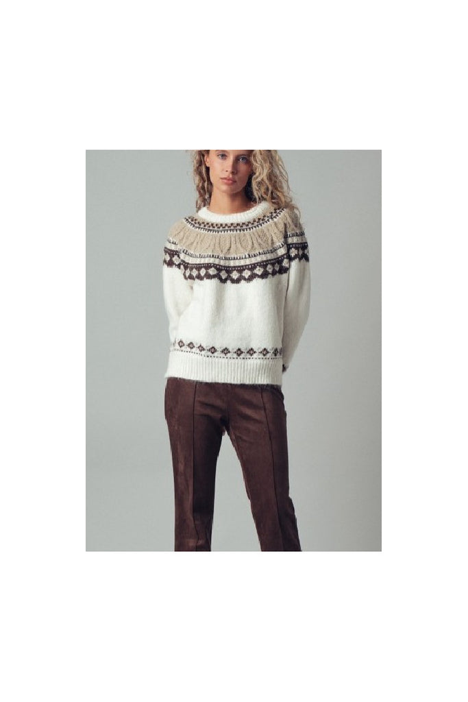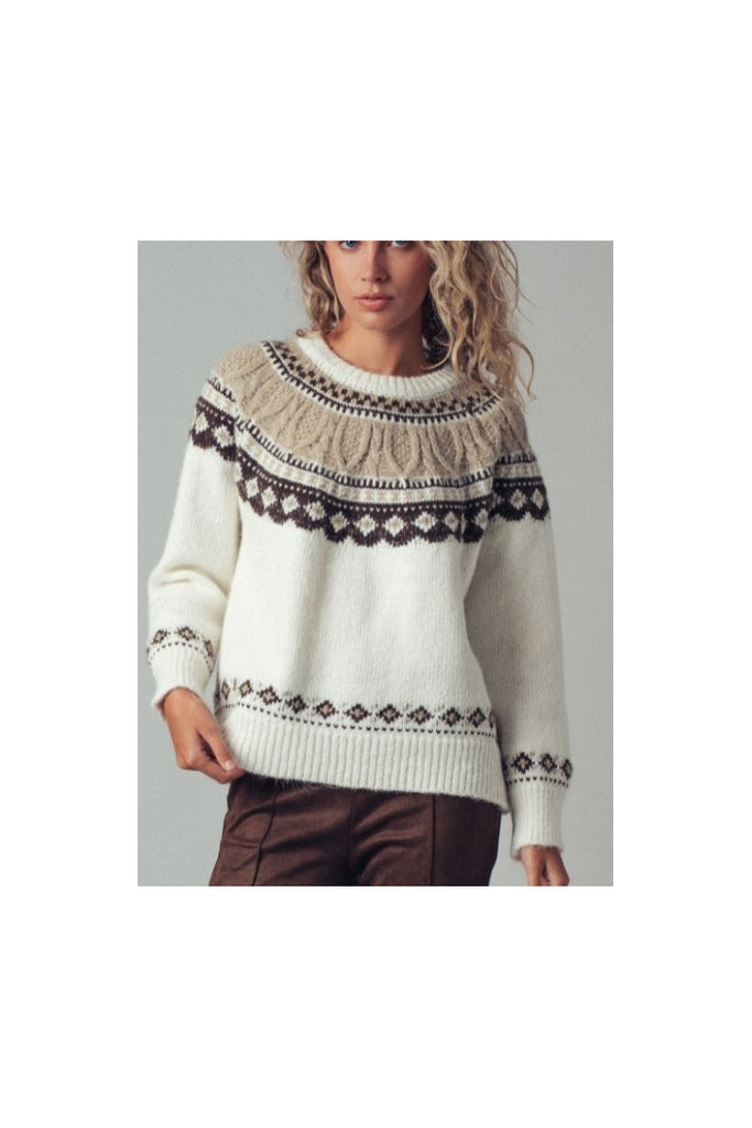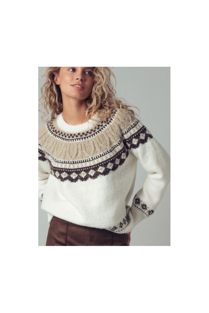 A timeless crewneck sweater featuring an intricate Nordic-inspired pattern and textured cable knit details around the yoke, perfect for cozy and stylish layering.