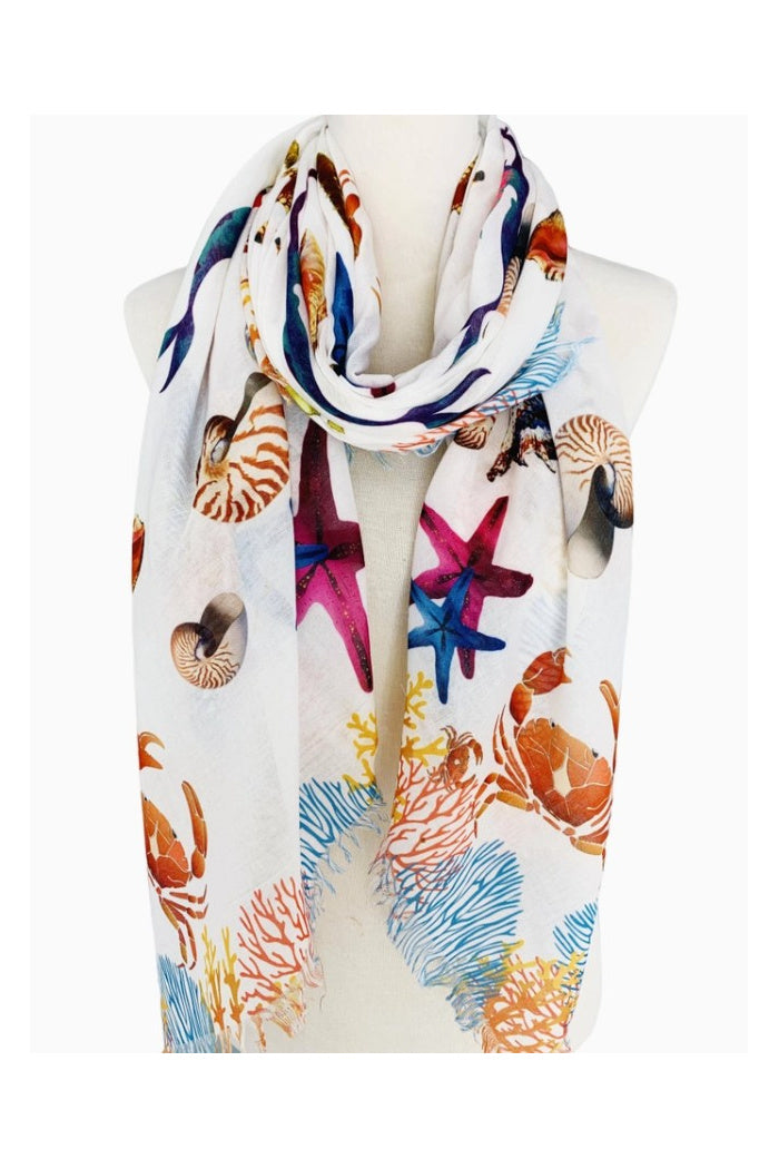 Wrap yourself in effortless coastal elegance with our Oversized White Sea Life Scarf / Shawl. Designed to be both lightweight and luxurious, this versatile piece features delicate sea-inspired motifs that bring a subtle, calming ocean feel to any outfit.