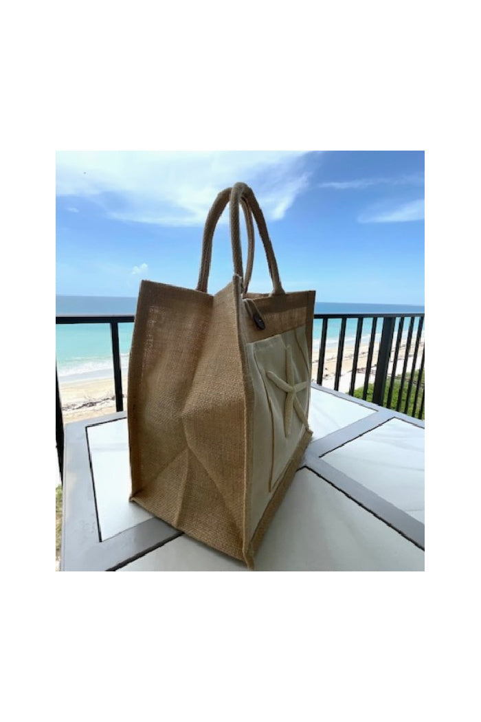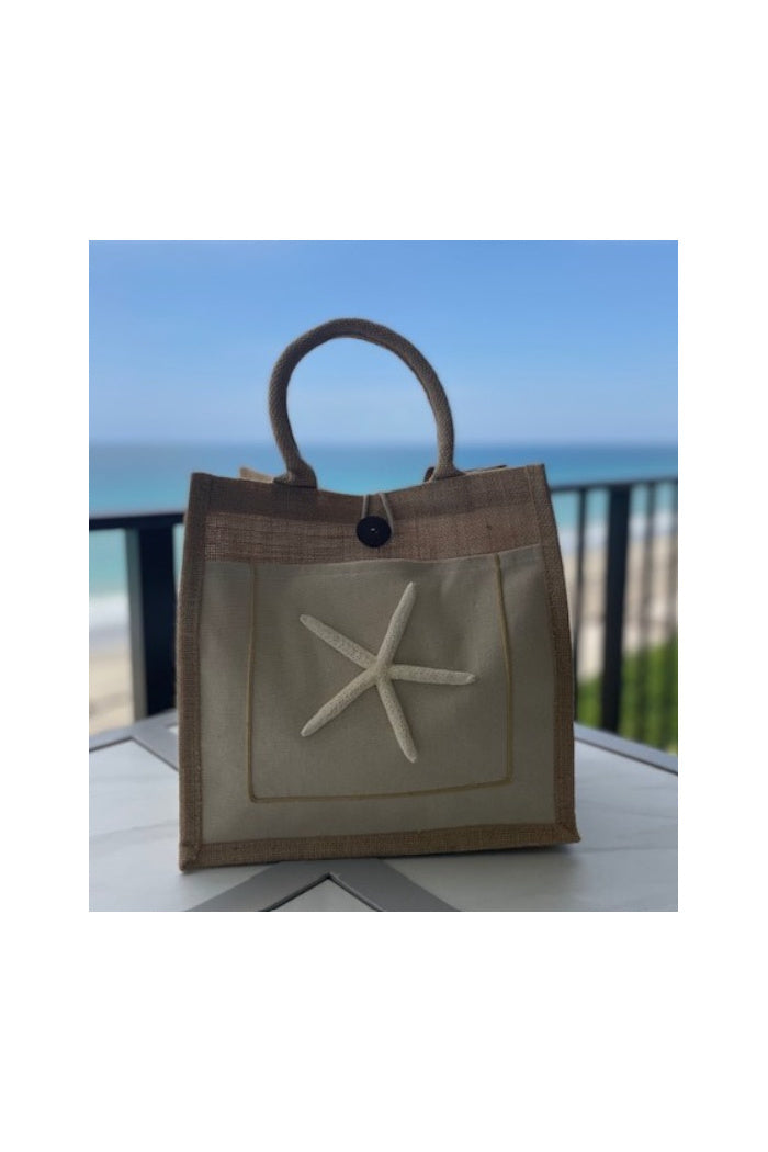 Super beachy handbag/tote with fabric handle. embellished with a real starfish to give it that coastal feel. plenty of room inside to use as a handbag or a tote
