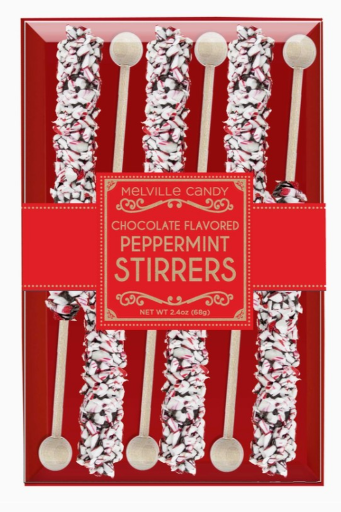 Pack of wooden stirrers coated in dark chocolate and rolled in crushed peppermint candy. Shown in rectangular red box with multiple stirrers arranged in two columns. Label indicates chocolate flavored peppermint stirrers and net weight 2.4 oz (68 g). Intended for stirring and flavoring hot or cold beverages.