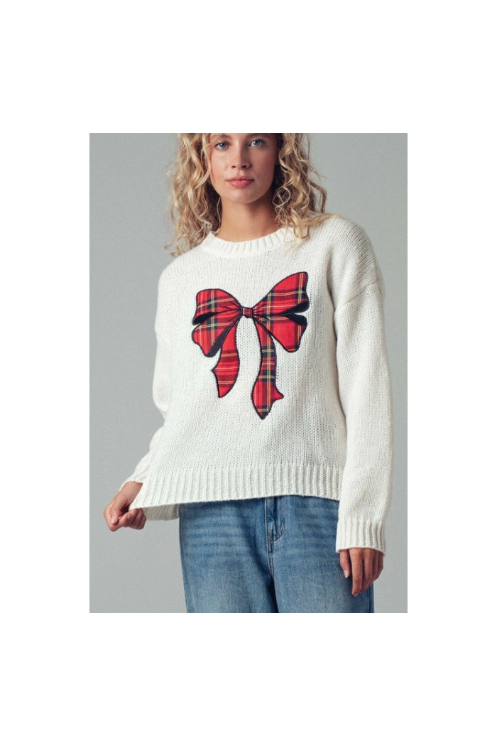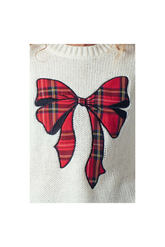 A whimsical twist on a winter staple, this soft ivory knit sweater features a bold plaid bow patch at the front for a pop of color and charm. Designed with dropped shoulders, rib-knit trims, and a relaxed fit, it’s perfect for both casual days and festive occasions.