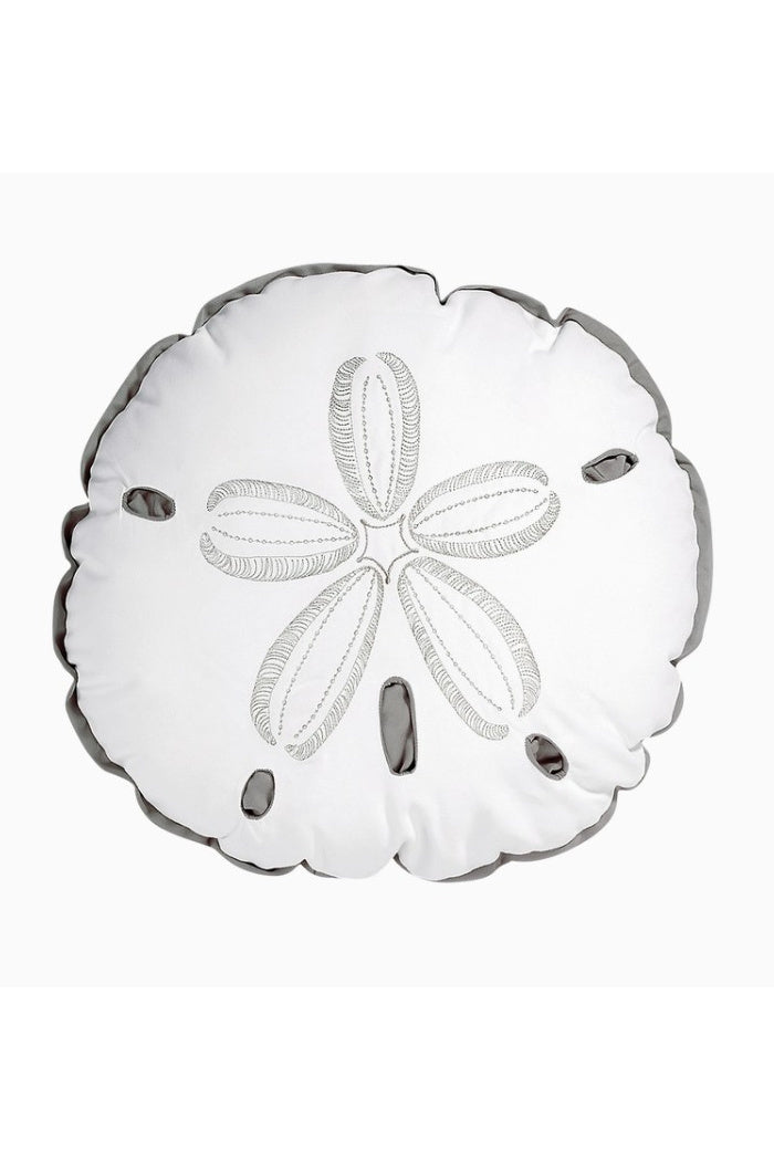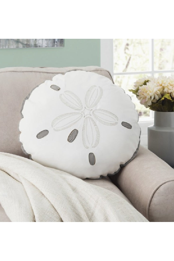 This sand dollar shaped gray indoor/outdoor throw pillow brings coastal charm to any seating area. The Sand Dollar Shaped Gray Indoor/Outdoor Throw Pillow from RIGHT SIDE DESIGN features a round silhouette, embroidered sand dollar motif and contrasting gray edging for a crisp, modern beach look. Made for indoor or outdoor use, it adds a sculptural accent and comfortable support to patios, porches, or living rooms.