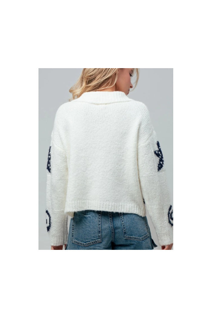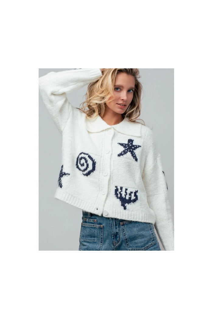Channel seaside charm with this delightful knit cardigan. Featuring playful nautical motifs like starfish and shells knitted into a soft, cozy blend, this collared button-down is the perfect layer for breezy coastal days or adding a touch of whimsy to your look.