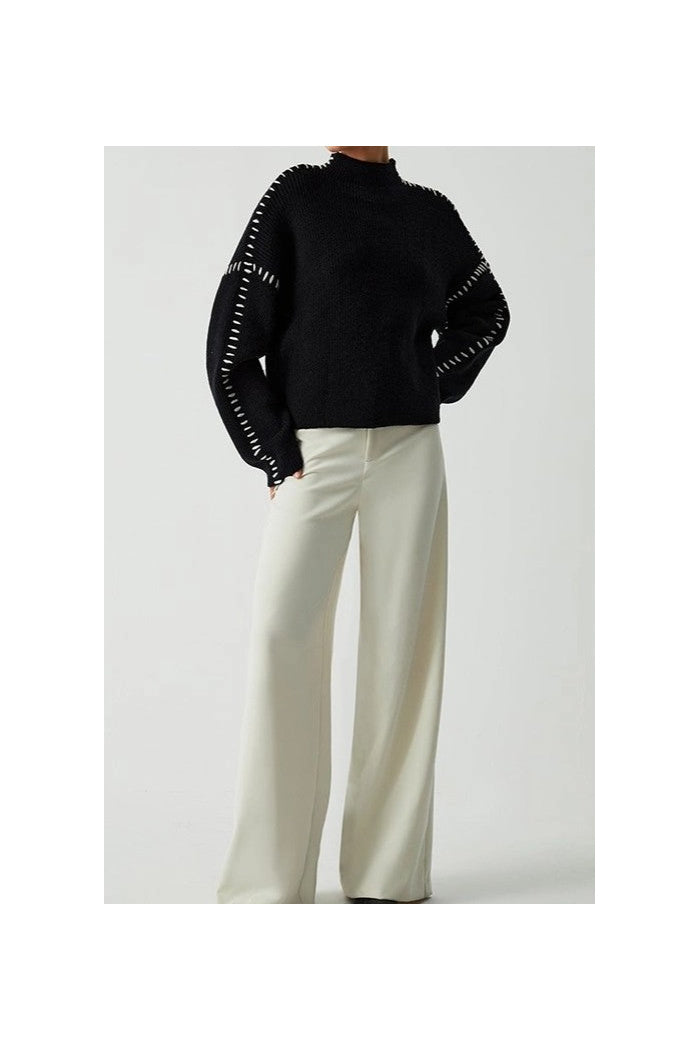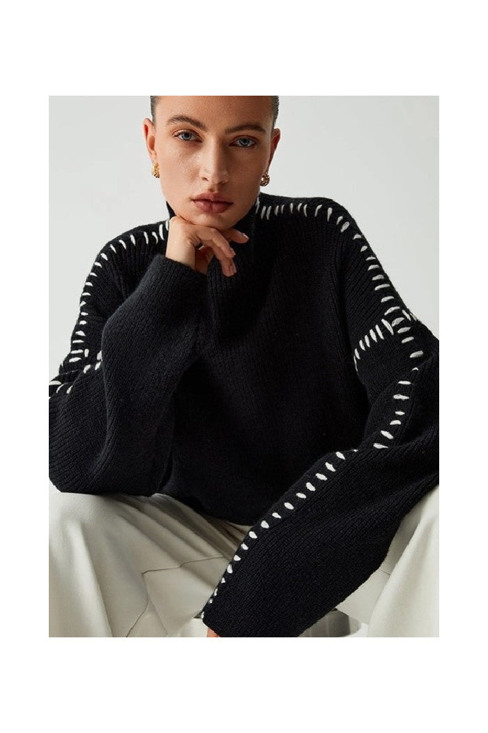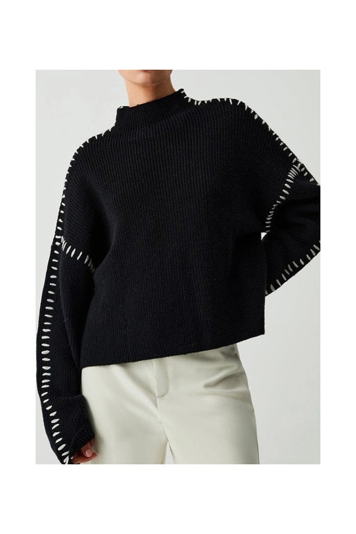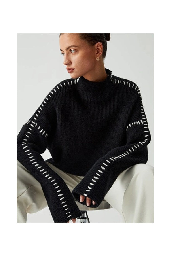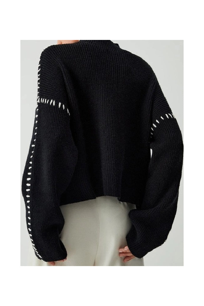 Black knit sweater with white contrast stitch detailing along the sleeves. Round neckline. Long sleeves with a relaxed, slightly oversized sleeve shape. Ribbed hem and cuffs are visible at sleeve ends.