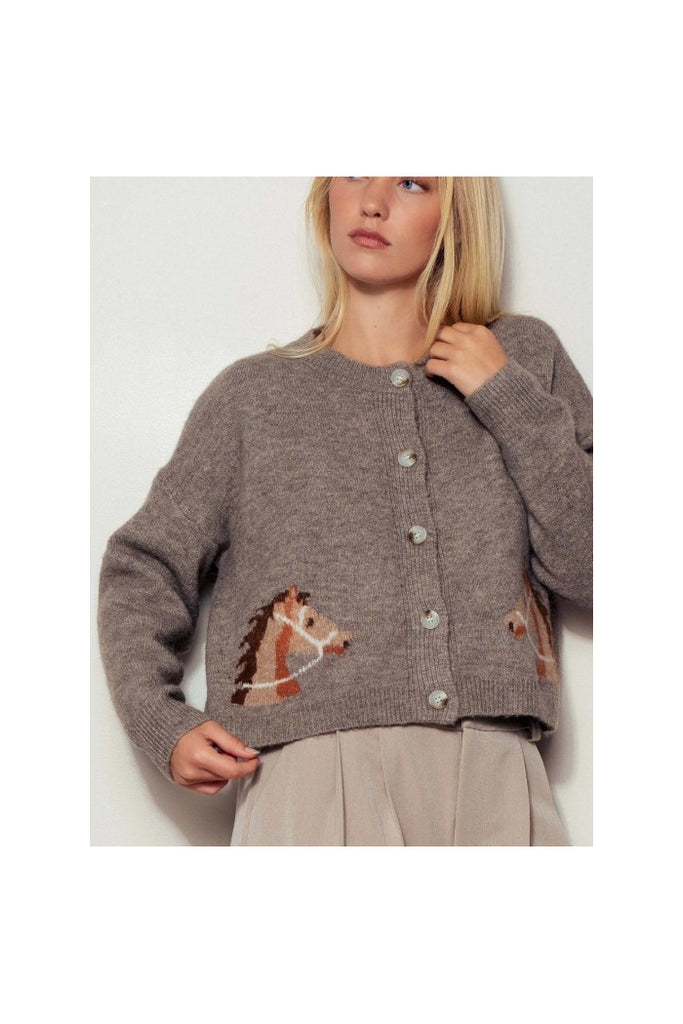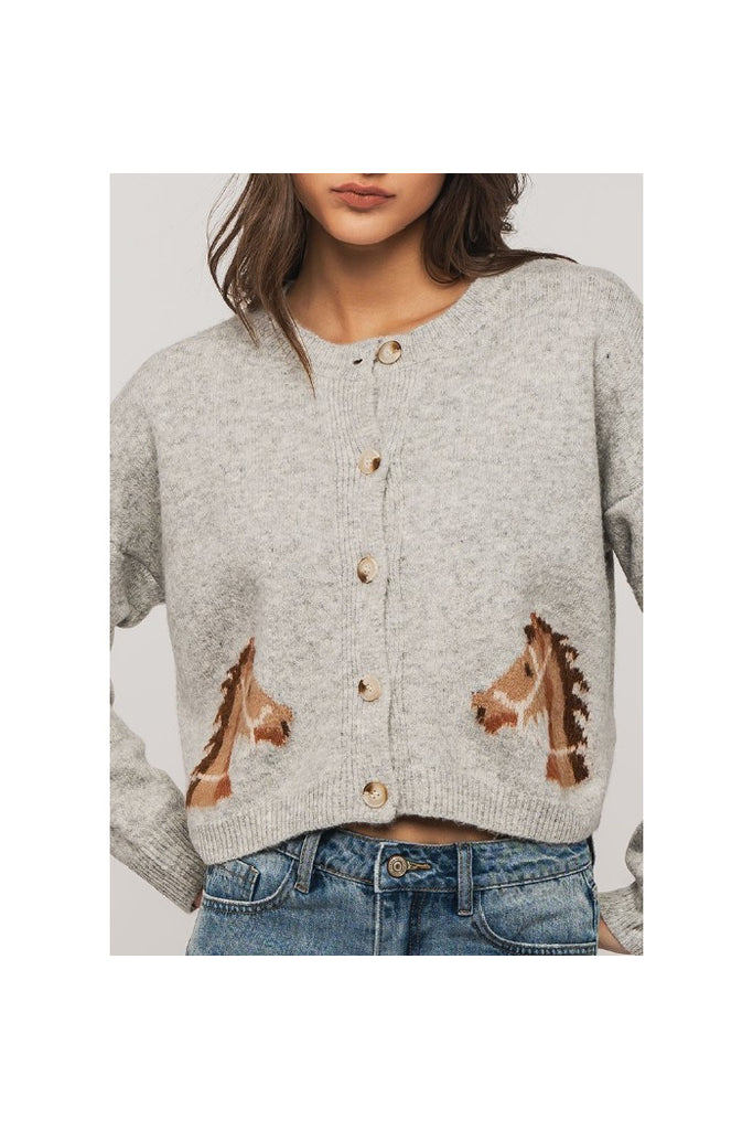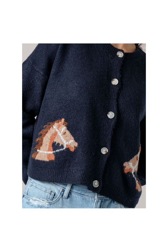 Western Horse Graphic Ribbed Trim Crew Neck Cardigan