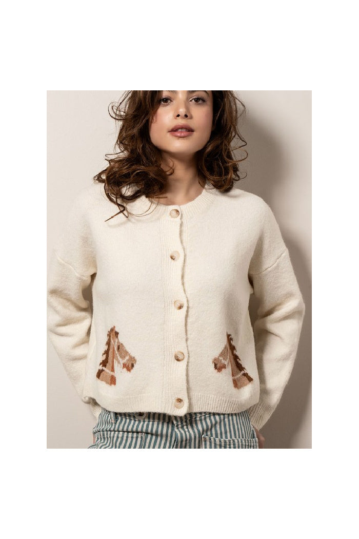 Make a statement in this charming cardigan featuring a playful horse graphic and classic ribbed trim detailing. The crew neckline and button-front design create a versatile silhouette perfect for western-inspired layering. The premium acrylic blend ensures cozy comfort while maintaining shape.