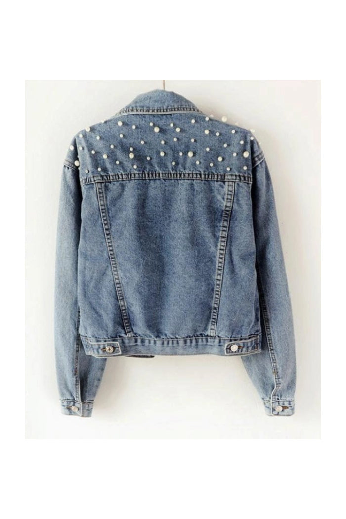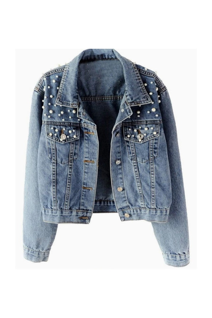 Women's Denim Jacket with Rhinestone and Pearl Embroidery